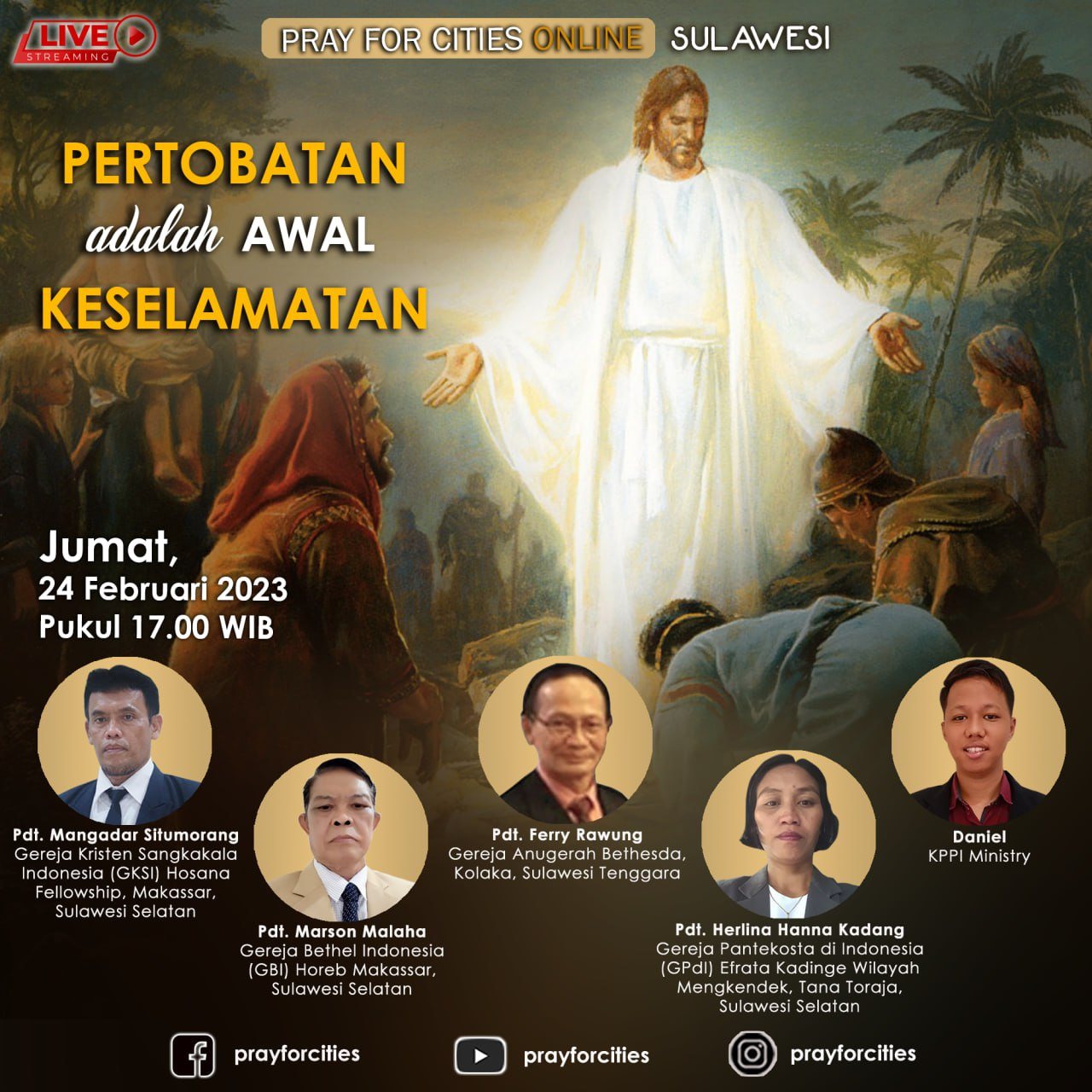 Puji Tuhan acara Pray For Cities Sulawesi dapat diselenggarakan kembali pada tanggal 24 Februari 2023 dan dapat disaksikan secara online melalui Facebook, YouTube dan Instagram.